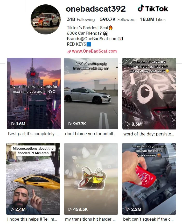 Videos average 100,000 to 375,000 views per post and sponsor stickers will be featured on the Onebadscat car for up to 30 days
